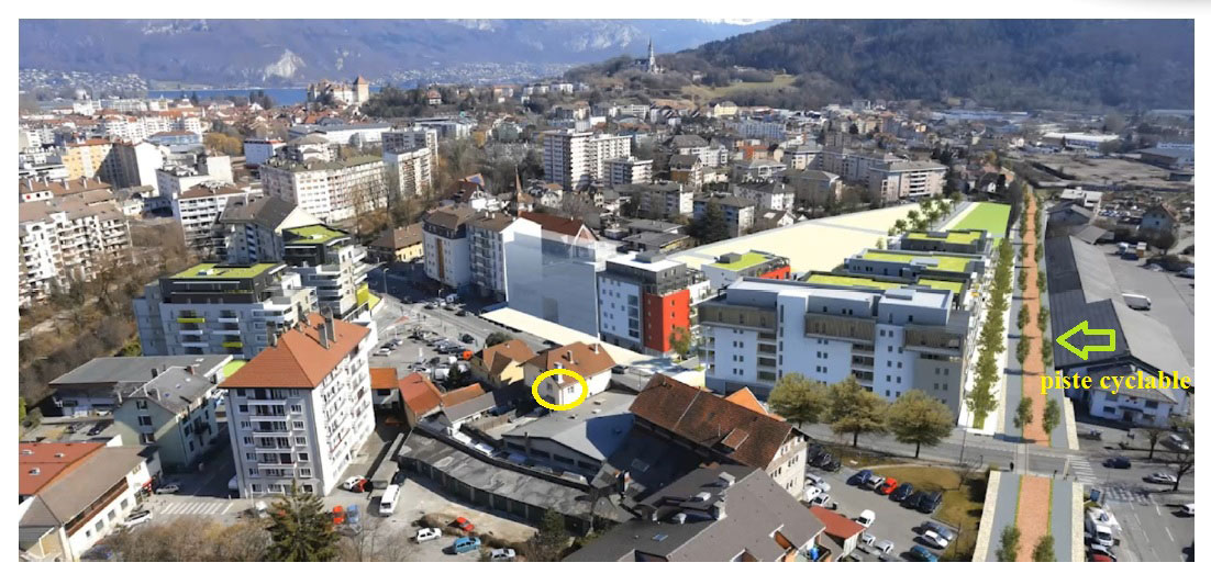 Image du projet du futur quartier du PONT NEUF. Les deux fenêtres de l'appartement sont dans le rond jaune.