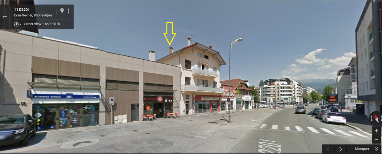L'avenue du Pont Neuf avec sa boulangerie au pied de l'immeuble. Le bâtiment est celui surmonté d'une flèche jaune. L'appartement ne donne pas coté rue.